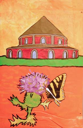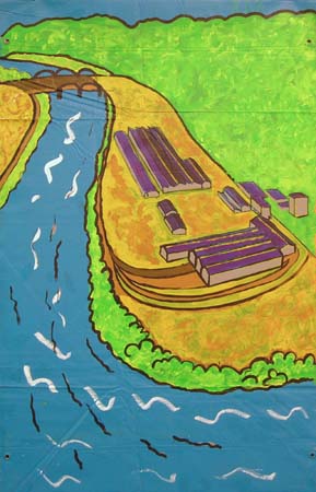 TRAIL ART INITIATIVE - Banner Art Banners are organized into five categories to reflect the diverse "lenses" through which the landscape can be viewed. Each category is represented by a color: Green: flora; Orange: history; Blue: river views; Yellow: fauna; Purple: trail users. Each banner is the result of many creative minds and hands. The 2007 Banners were designed by graphic design students at the McKeesport Area Technology Center instructed by Michael Spagnola and students at the Art Institute of Pittsburgh through classes taught by Ann Rosenthal. AIP instructor Karen Antonelli created the designs for the purple (trail user) banners, and contributed background designs that served as backdrops for some of the student designs. In many cases, two or more designs were combined to make an interesting composition. The designs were then painted through a series of community workshops in McKeesport and Pittsburgh, which included over one hundred people of all ages and abilities, with the majority being students between the ages of 8 and 20. The 2008 Banners were researched, designed, and painted by Propel Middle School students in Homestead and McKeesport. CTAI director and community artist Ann Rosenthal worked with Stefanie Maas' art class at Propel Homestead and the Art Club at Propel McKeesport supervised by teacher Brad Gentile. It was a privilege to work with these dedicated teachers, and Propel Schools were wonderfully supportive of the Initiative. Given Propel's interdisciplinary and arts focus, the CTAI was a great fit! After the banners are painted by the students, they are refined and finished by AIP students, local artists, and Ann Rosenthal. This final step gives the banners a professional touch. The banners thus become a collaboration between aspiring and seasoned artists and designers! Our gratitude goes to JoAnn Moran of rePublicArt.org for advising and leading the workshop at the Three Rivers Arts Festival, and putting finishing touches on many of the banners. Special thanks also goes to Ray Oakes, a graduate of the Art Institute, who put in many long hours at the Arts Festival and afterwards to complete the banners. Additionally, our appreciation goes to the AIP Graphic Design Club and its president, Alex Harvilla, for helping out at the Arts Fest. The creation of the trail art banners is truly a community endeavor that reflects the creativity and good will of the citizens of this region!